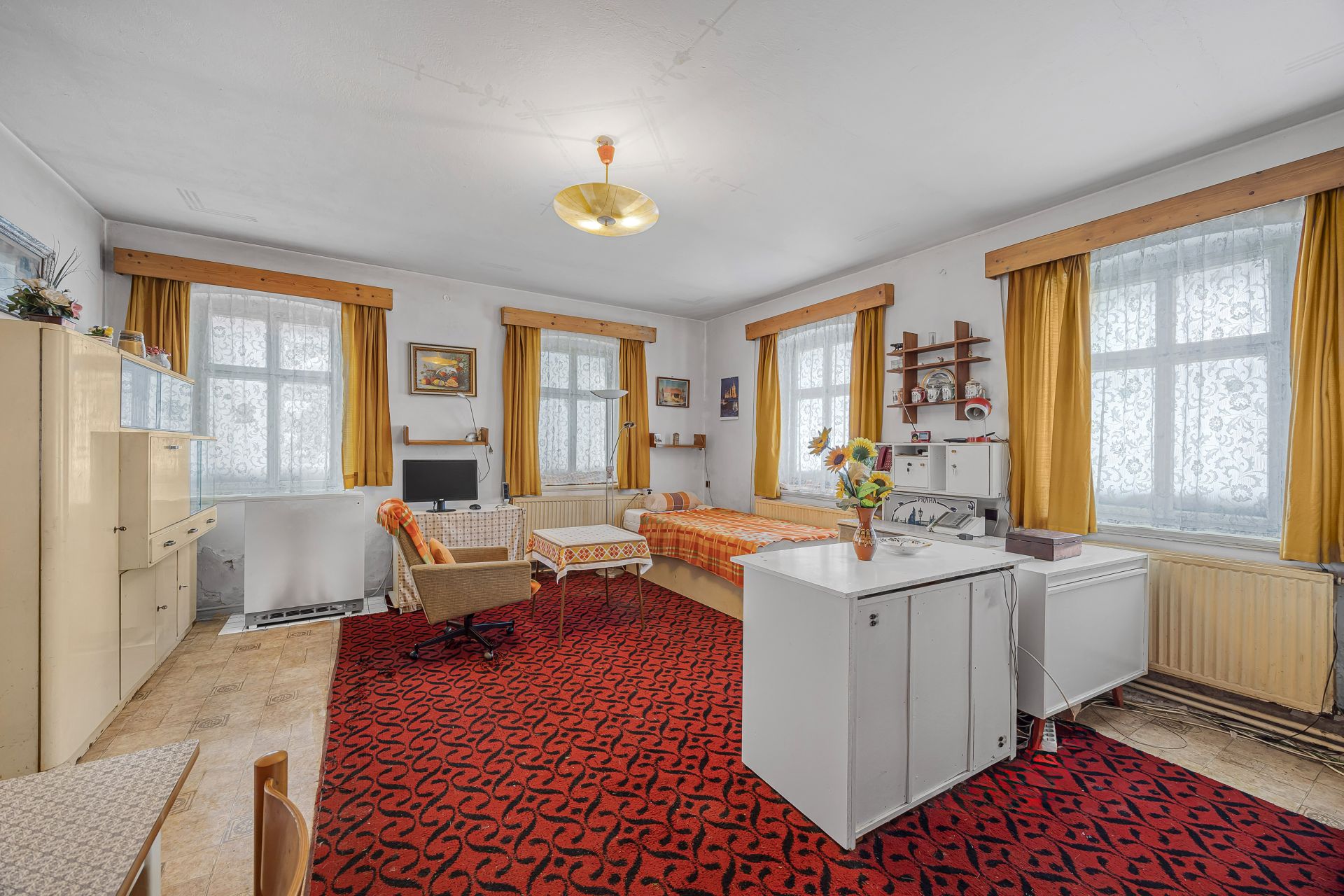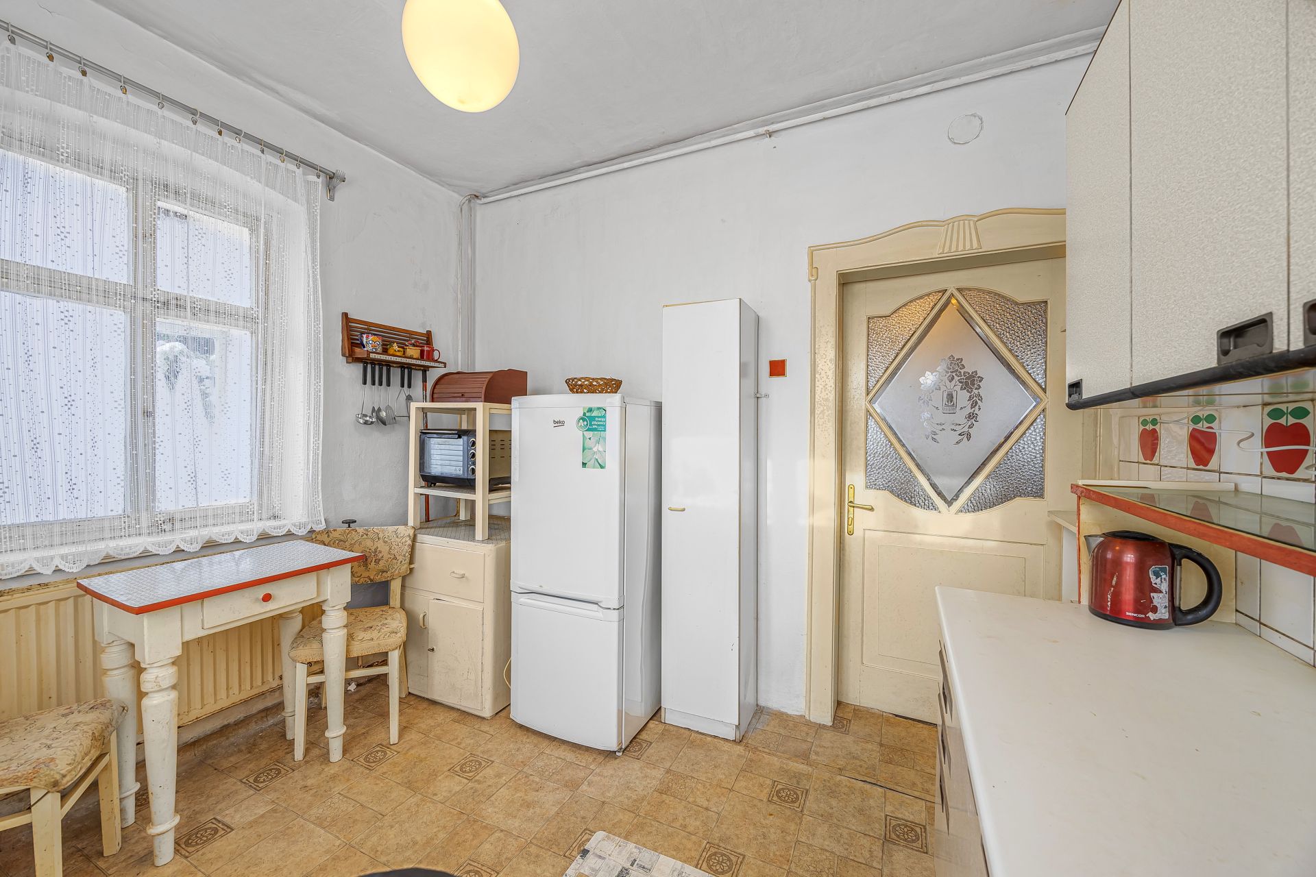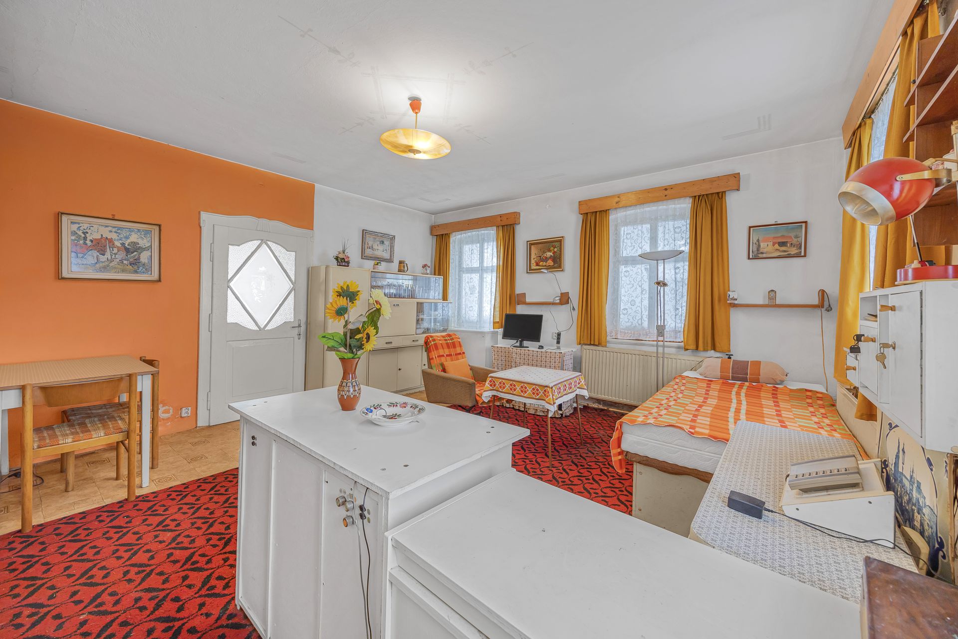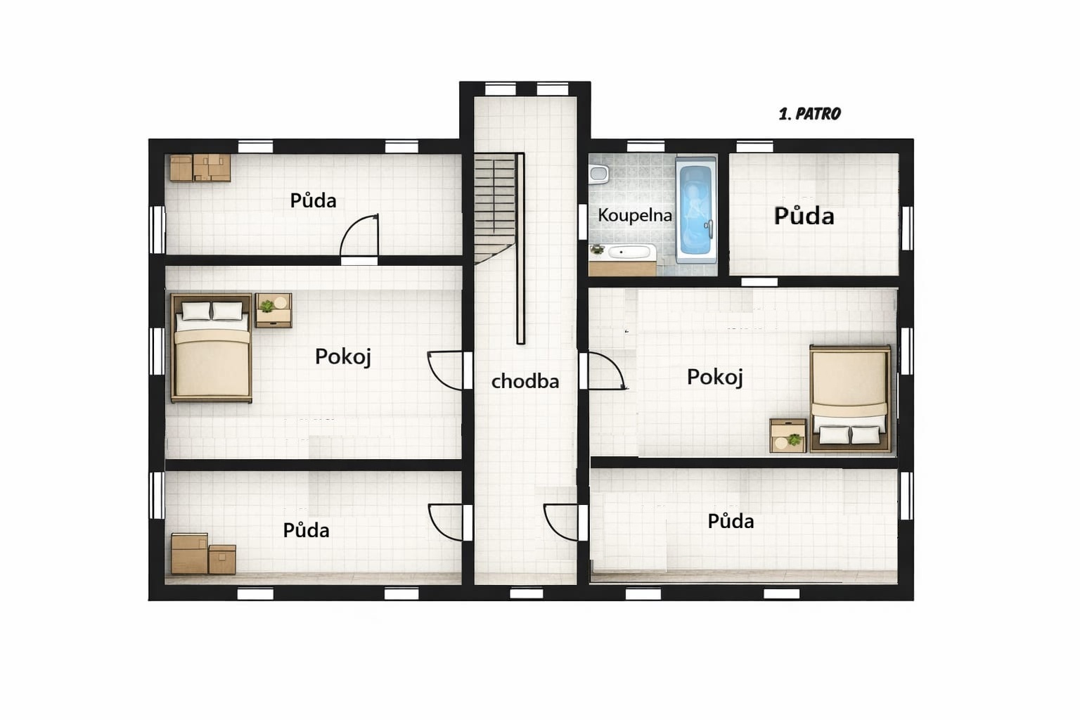 V přízemí domu se nachází dispozice 3+1, koupelna, samostatné WC a vstup do sklepa. První patro nabízí dva velmi prostorné obytné pokoje, koupelnu a tři půdní prostory, které lze využít jako úložné prostory nebo je případně stavebně upravit dle vlastních představ.