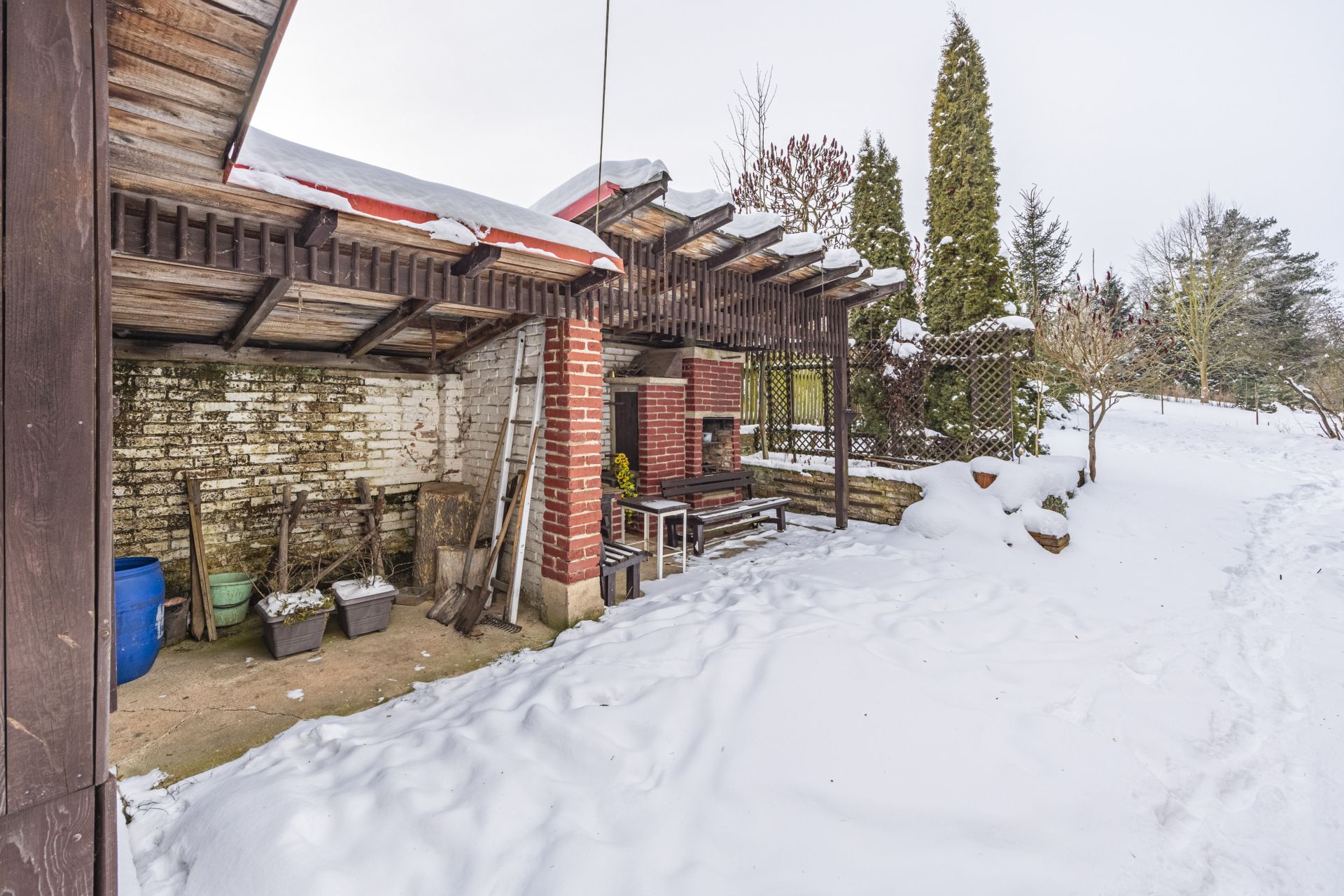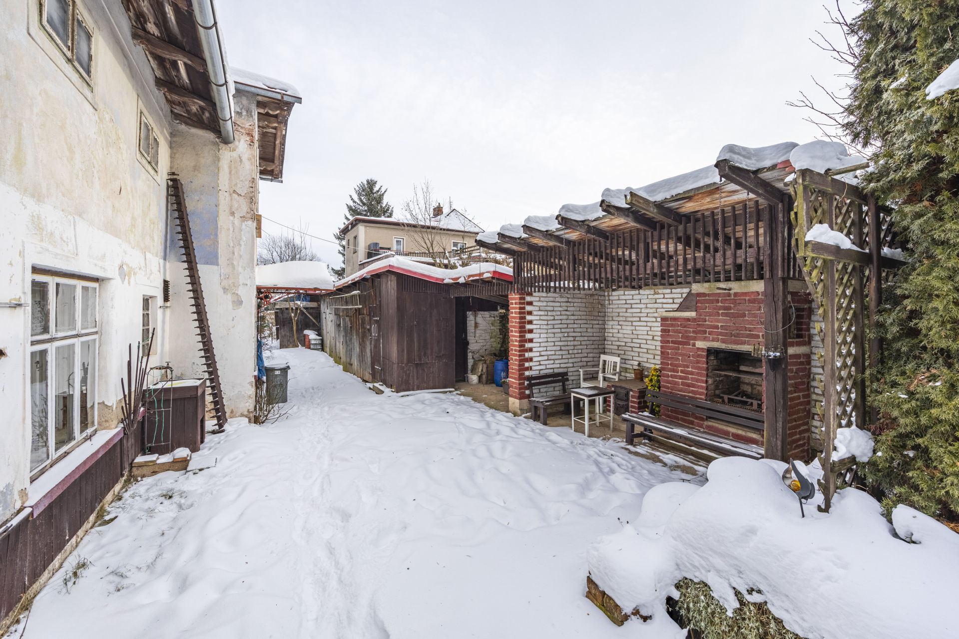Součástí nemovitosti je samostatná garáž o velikosti 16 m², dále se za domem nachází kůlny a úložné prostory vhodné pro uskladnění nářadí a sezónních věcí. Na pozemku je rovněž příjemné posezení s venkovním grilem, ideální pro relaxaci a trávení volného času.